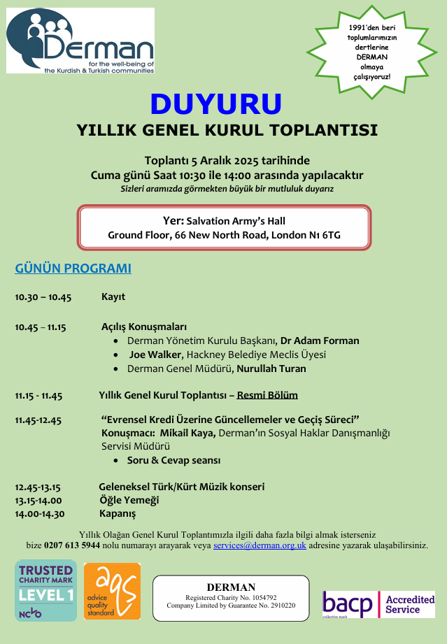 Kendinizde yukarıda belirtilen zor duyguların iki haftadan daha fazla sürdüğünü farkederseniz ve Hackney sınırları içinde yaşıyorsanız 02076135944’tan DERMAN’ı arayabilirsiniz. Hackney dışında yaşayanlar kayıtlı oldukları GP’leri arayarak o bölgedeki NHS IAPT servislerine sevk edilmek isteyebilir. Derman ve IAPT servisleri yukarıdaki belirtilerle başa çıkmak konusunda kısa süreli olarak en yakın zamanda psikolojik destek sunacaklardır.
